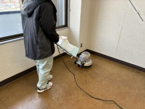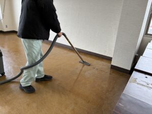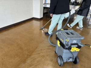 当日は、ポリッシャー(床洗浄機)を使った洗浄作業や、業務用掃除機での吸引、水拭きなどが段階的に行われていました。